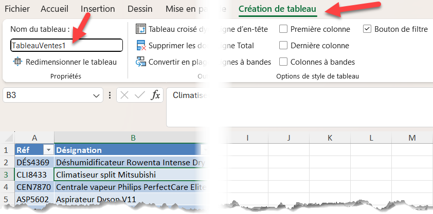- Cliquez dans une cellule de chaque tableau pour les renommer tour à tour depuis l’onglet Création de tableau (ruban) :